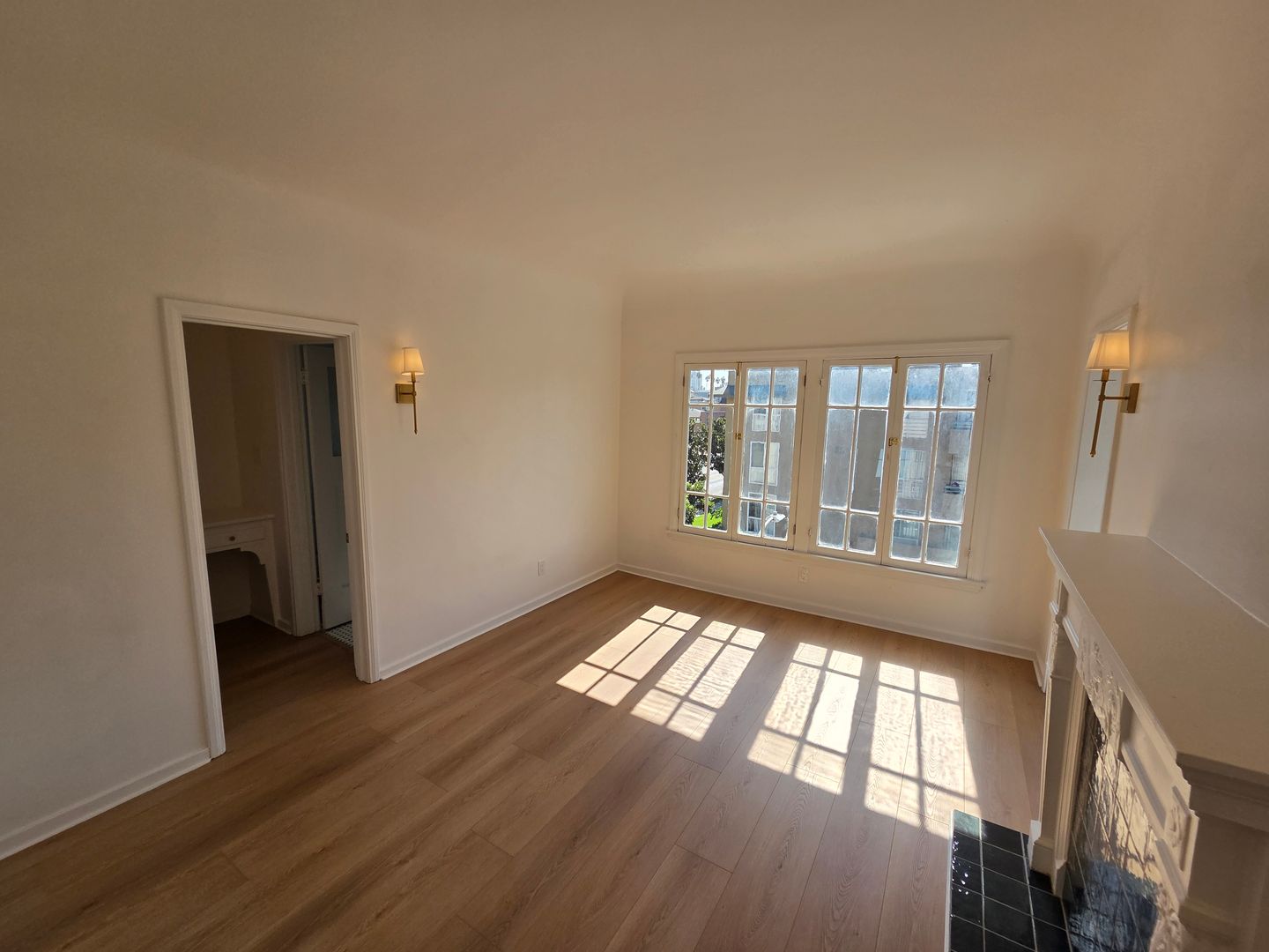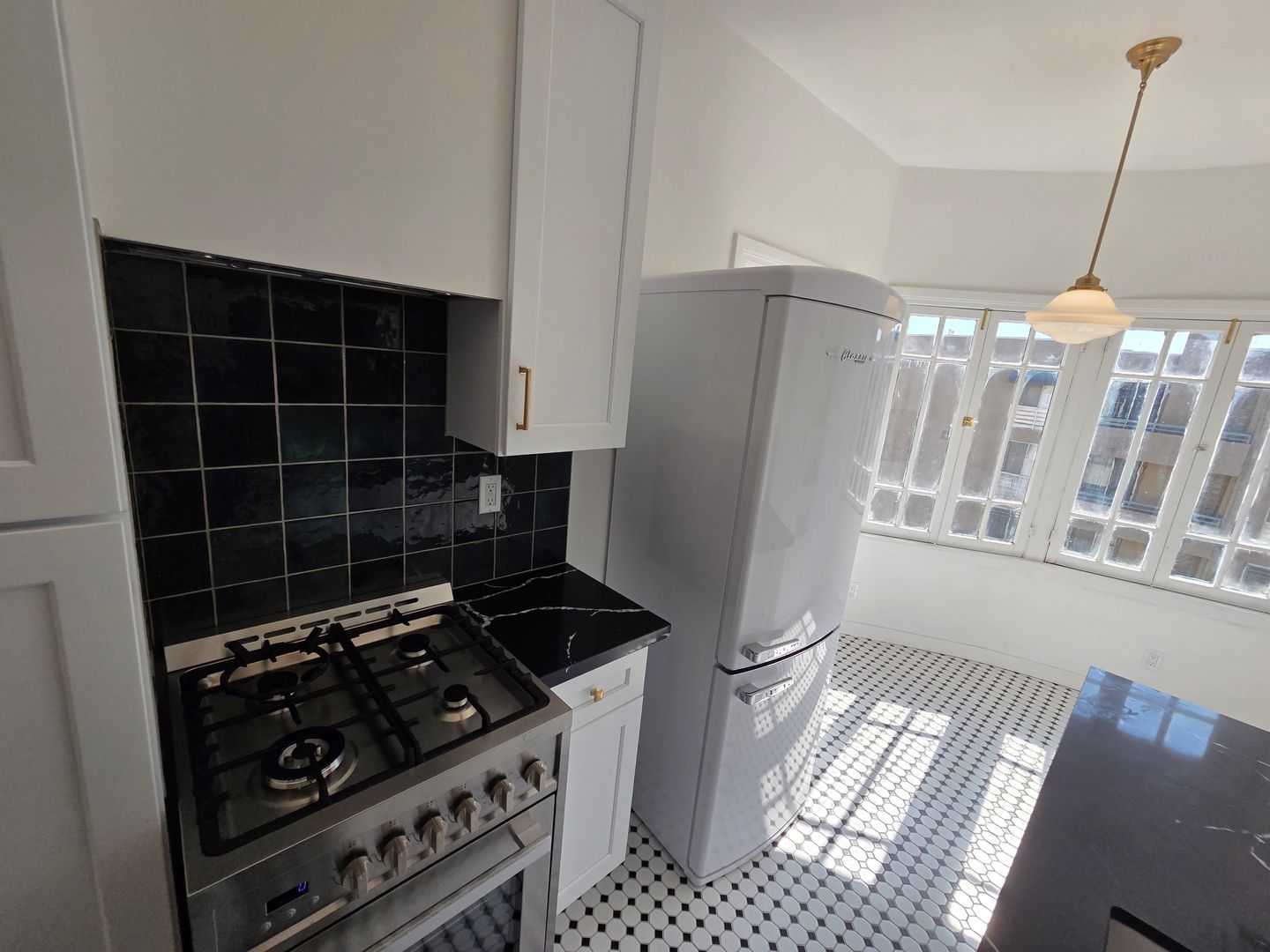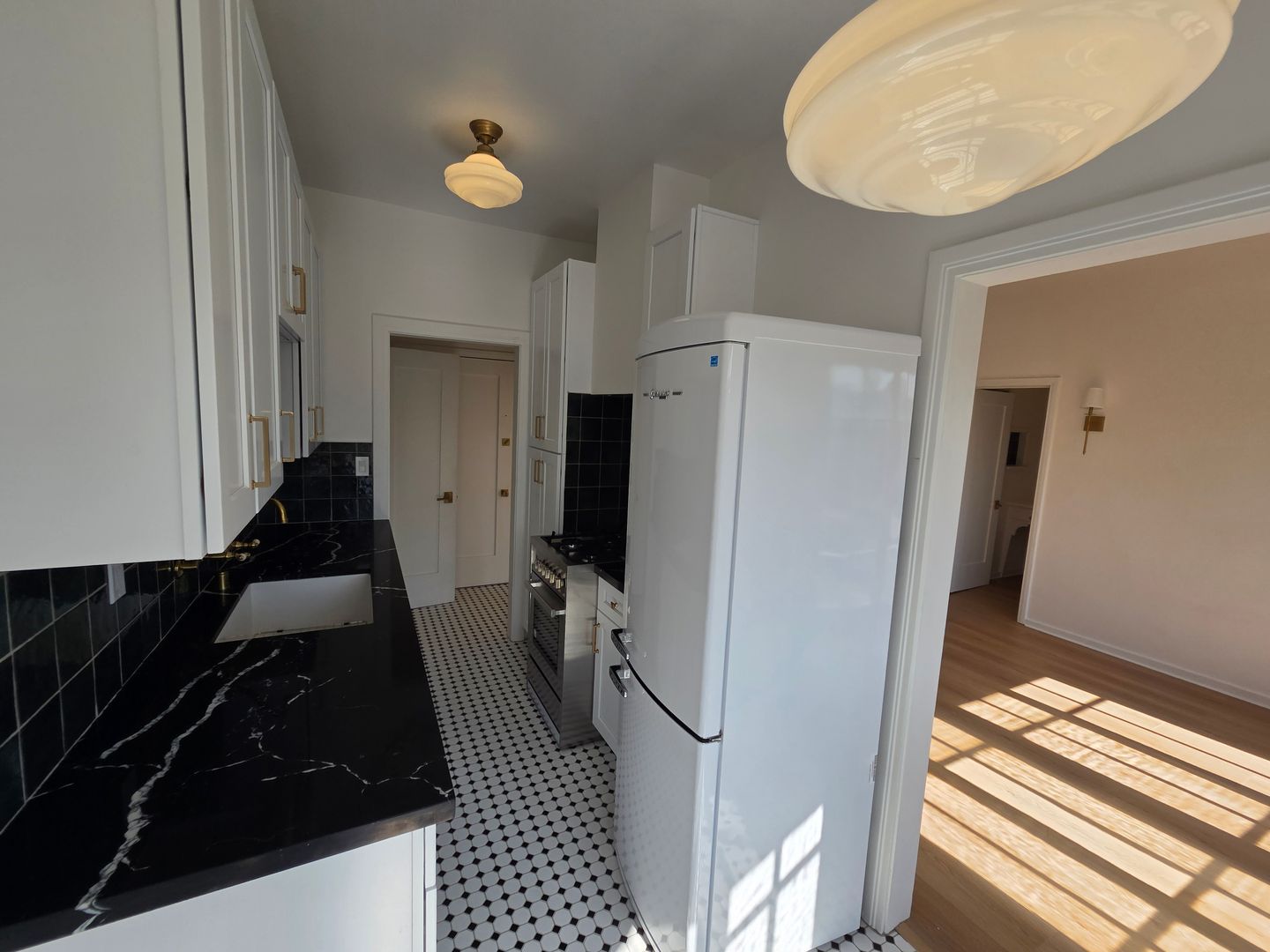 There's bright new flooring throughout, recently installed light fixtures, high ceilings, and large windows. With a beautiful decorative fireplace and a built-in vanity, this studio still retains its originality. The kitchen has been updated with beautiful countertops and a Classic retro fridge to complement the vintage floors. The full bathroom boasts a large tub to destress after work. There is plenty of storage, including a large closet and two additional storage closets. With the feel of a large one bedroom, this unit is the perfect opportunity to finally have a space of your own.