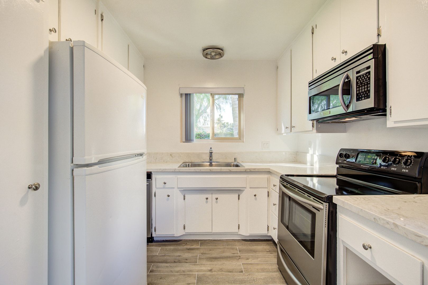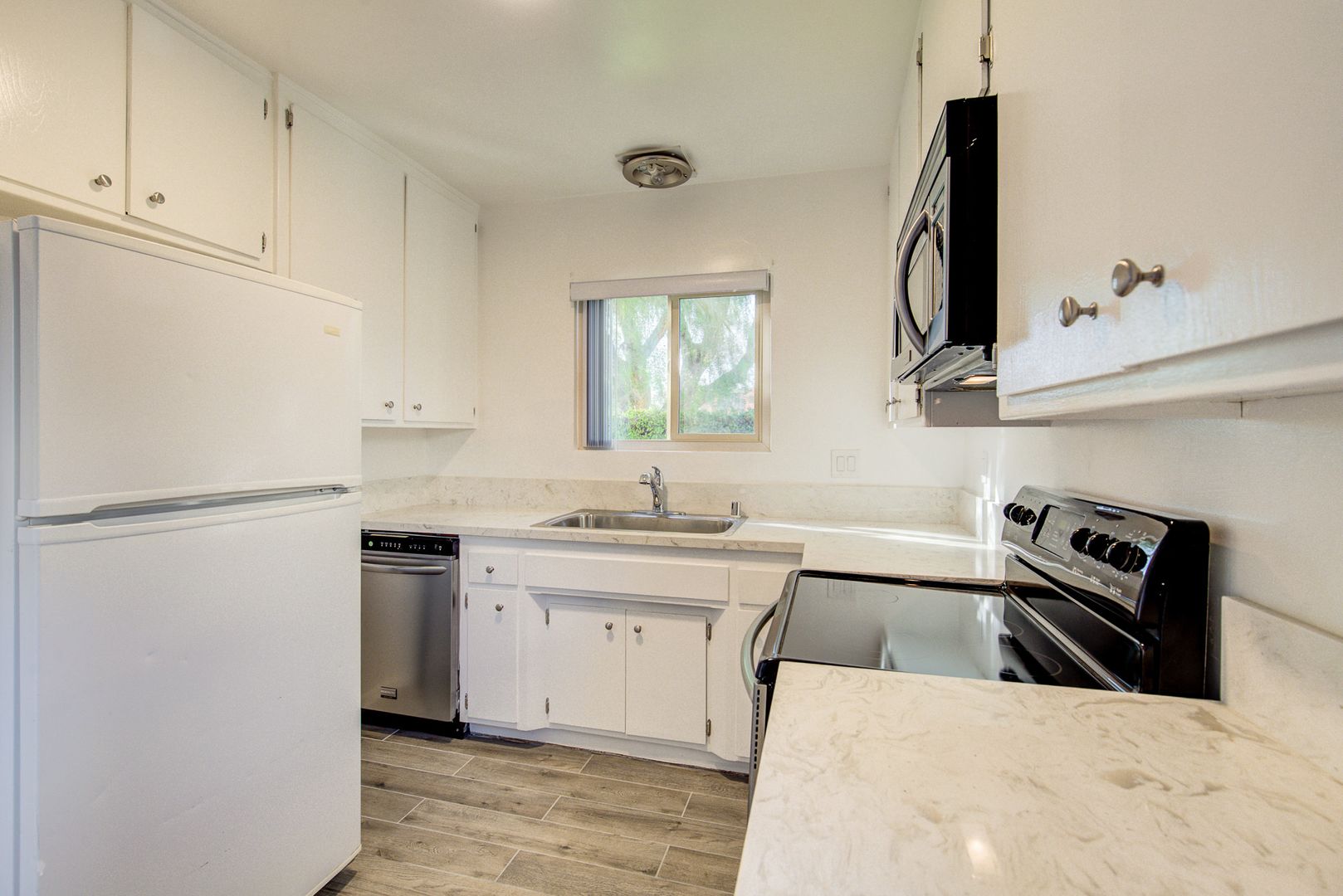 Spacious first-floor unit featuring oversized rooms and generous closet space, recently remodeled and move-in ready. The bright, open living area flows into an updated kitchen equipped with all appliances, including a dishwasher.