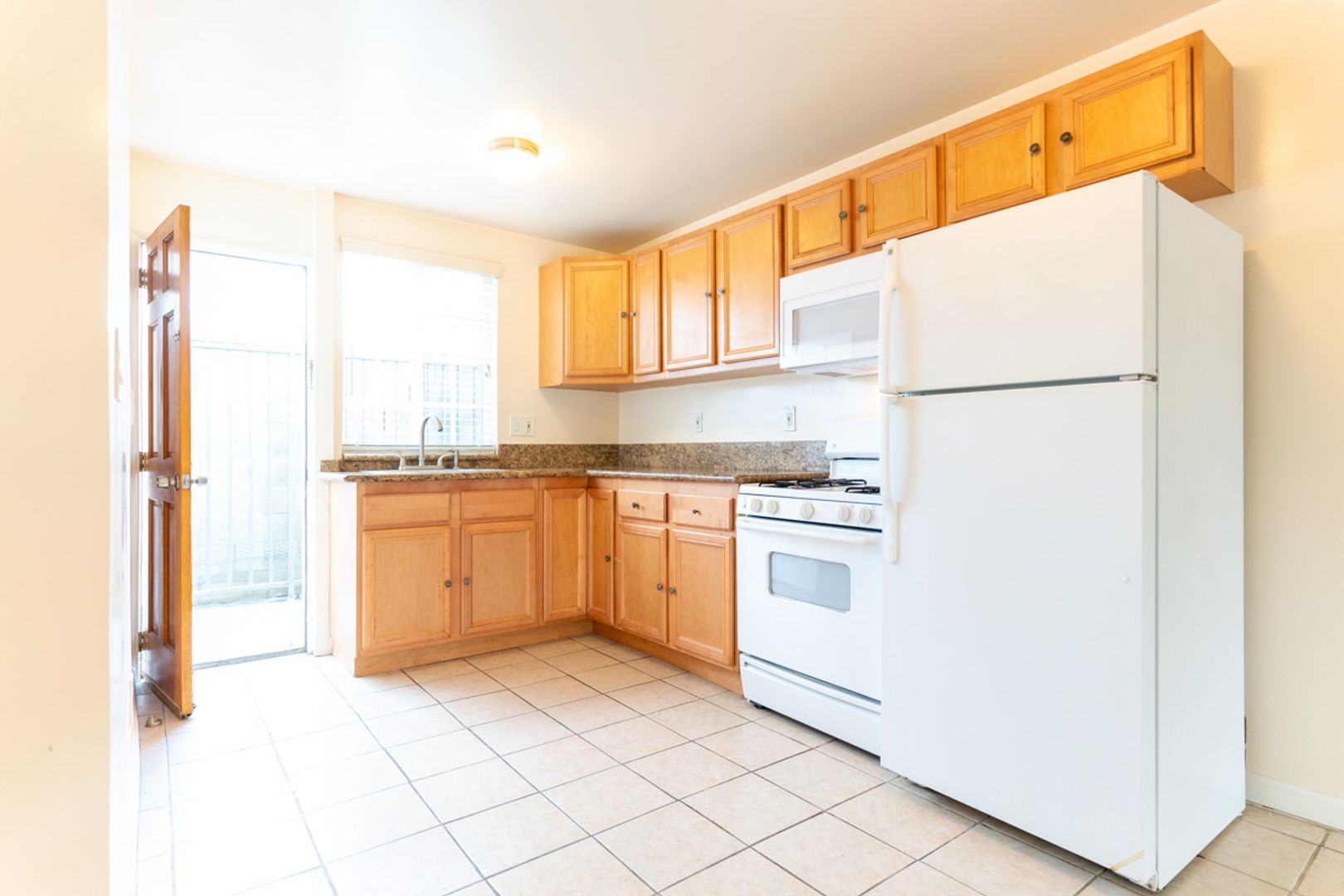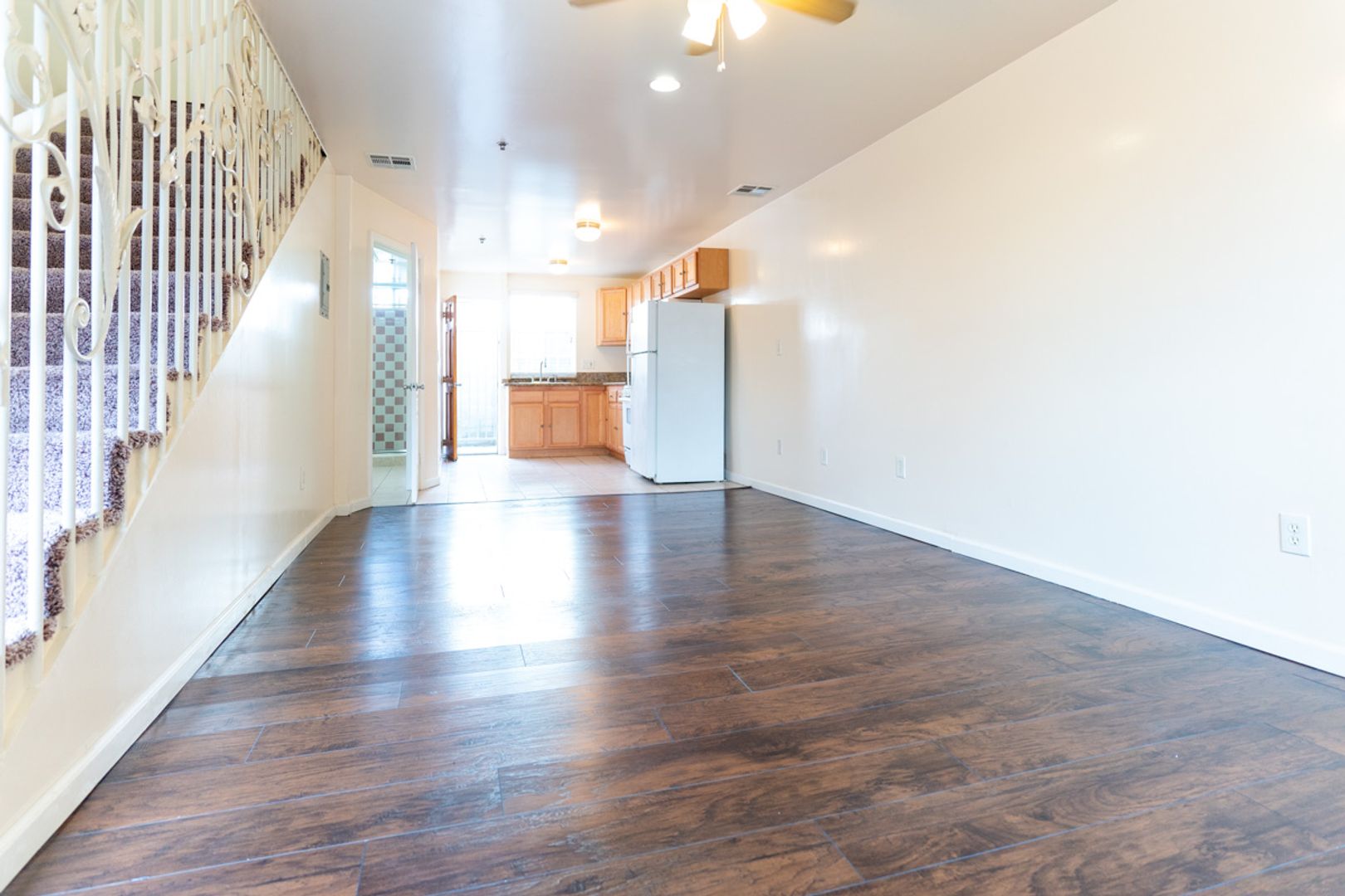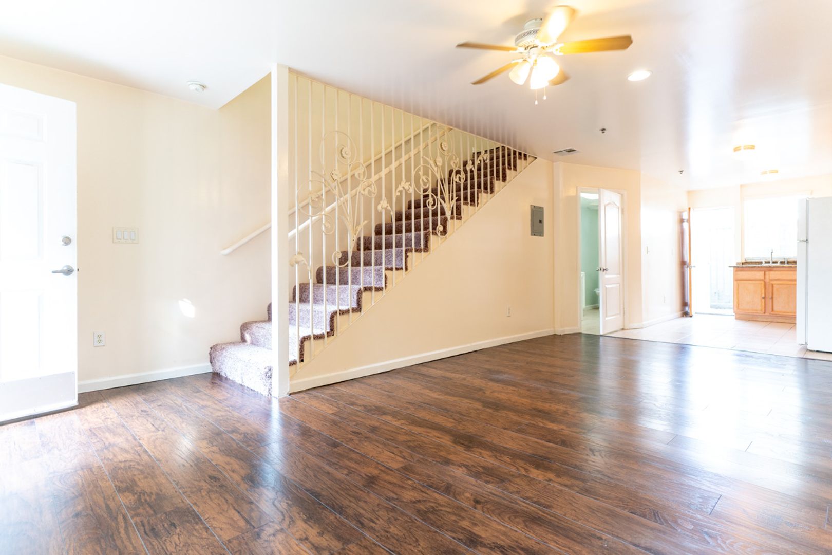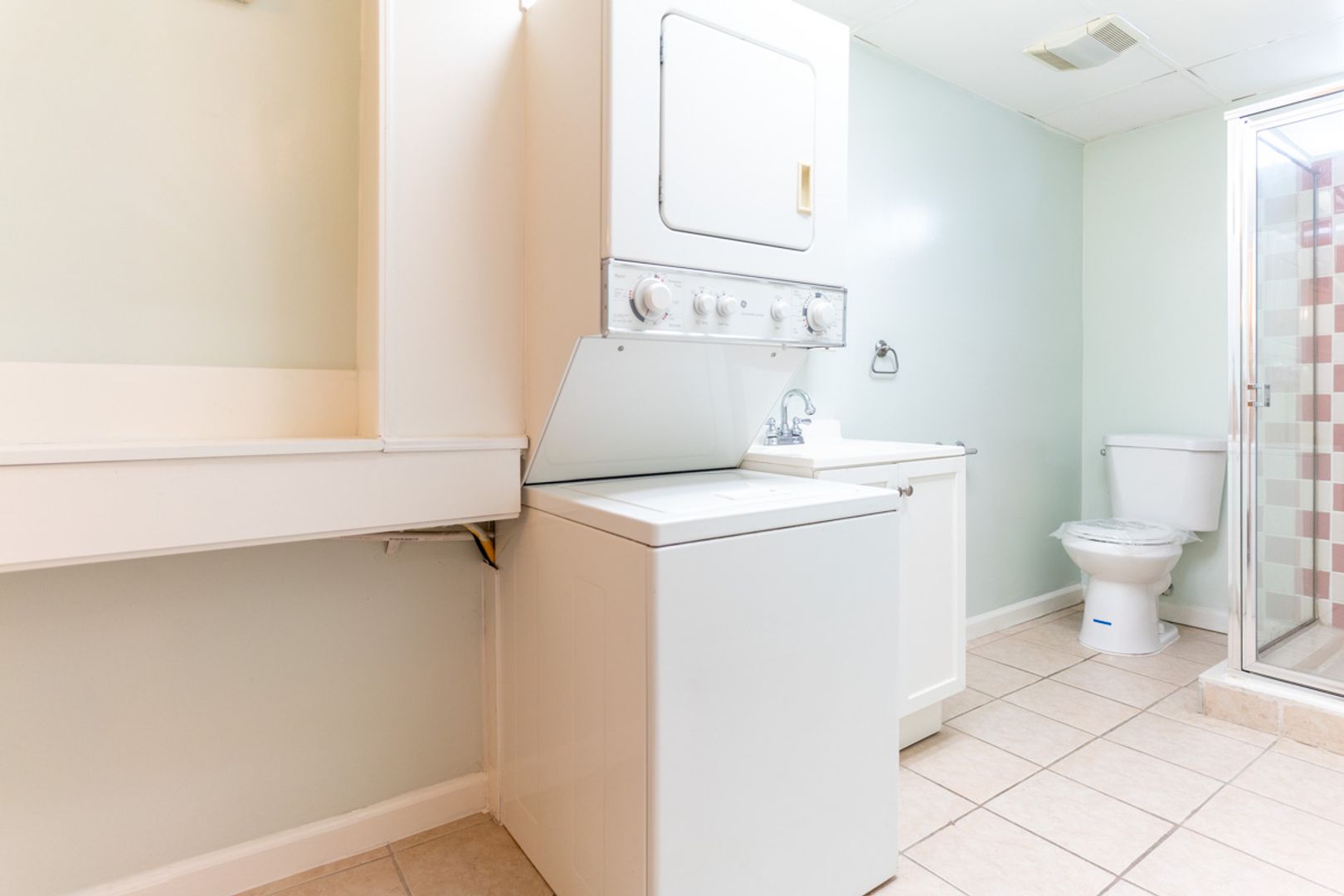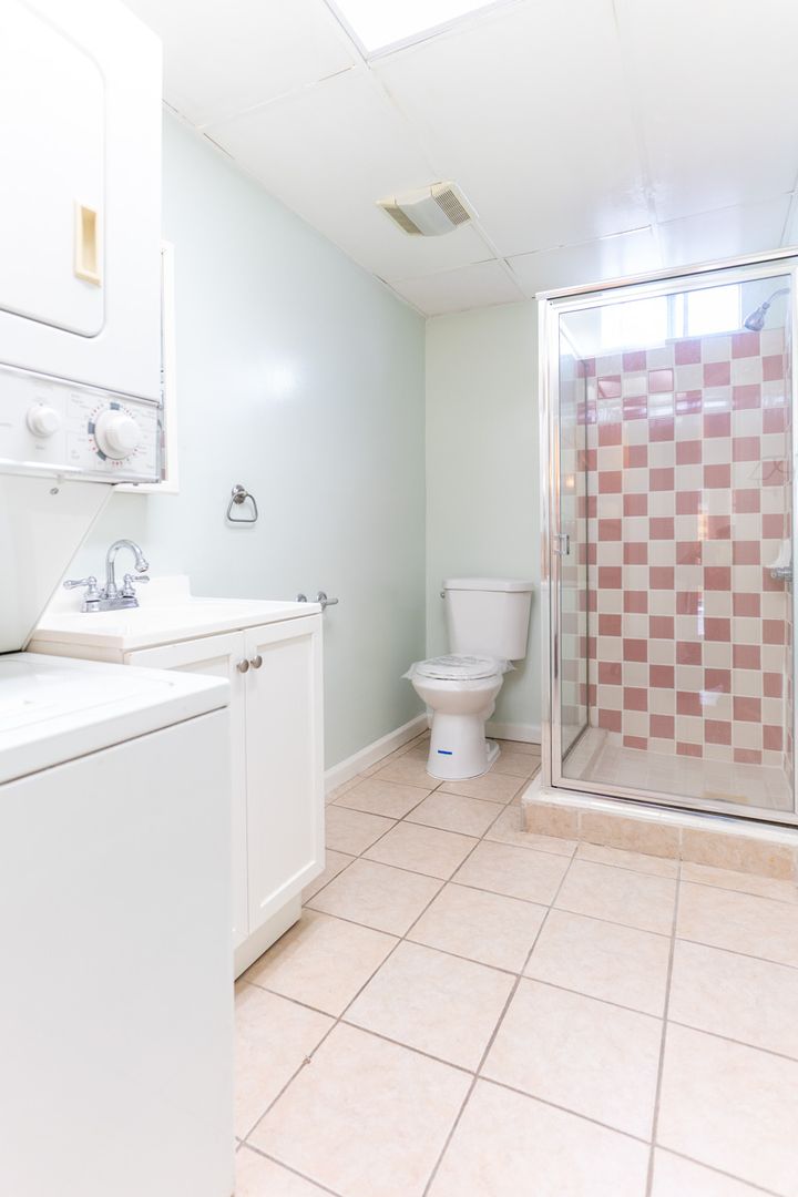 Ground floor features open concept living room flowing into kitchen with plenty of cabinet space and counter space - stove and fridge included. Also has 1 3/4 bathroom with in unit laundry stack and storage closet.