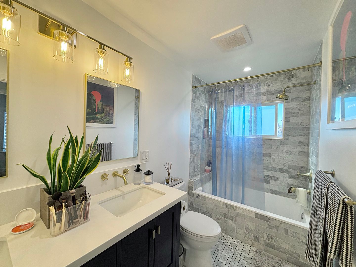 Step through your private gated entry and into a bright top-floor home featuring thoughtful modern upgrades throughout: stone countertops, designer tilework, custom cabinetry, split-system AC/heat, and a full suite of stainless-steel appliances, including a dishwasher.