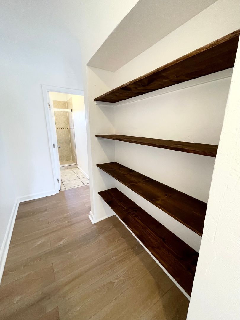 Take a walk down the hall to find each of the bedrooms on the right side, built-in shelving along the hallway walls, and the bathroom at the end.