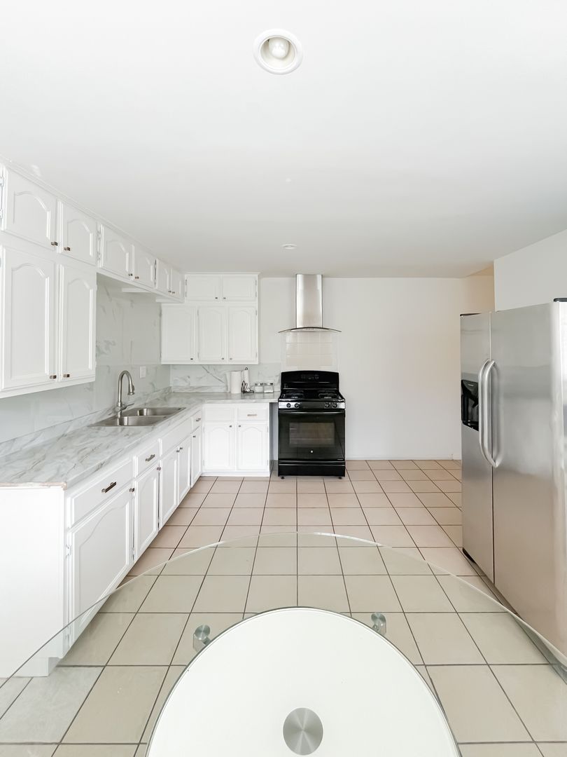 - Modern kitchen with ample cabinetry, sleek countertops, gas range, and stainless steel fridge