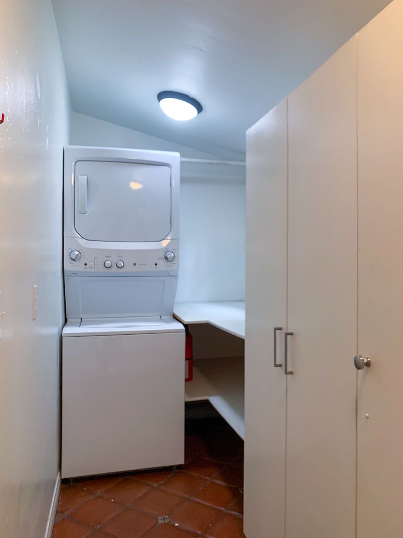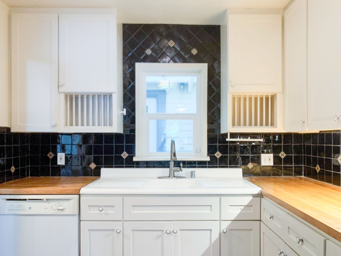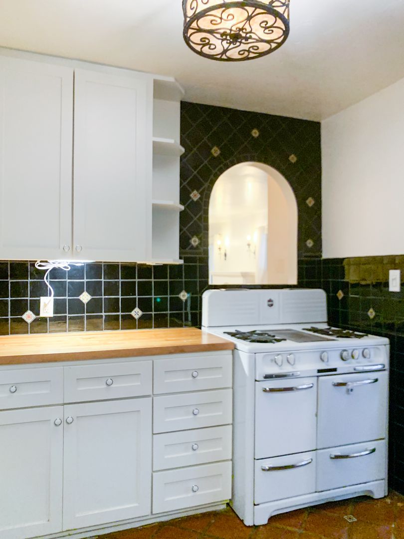 Kitchen - Vintage tile, period stove, refrigerator, dishwasher, walk in pantry with washer/dryer stack