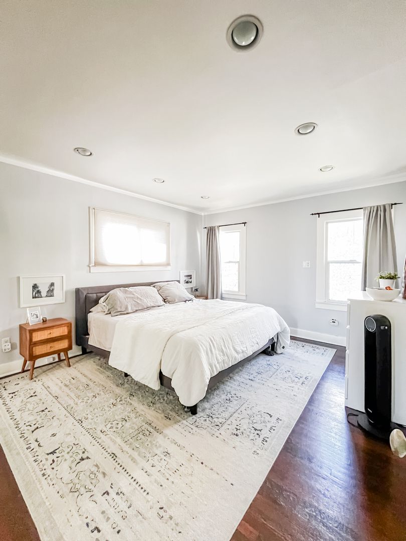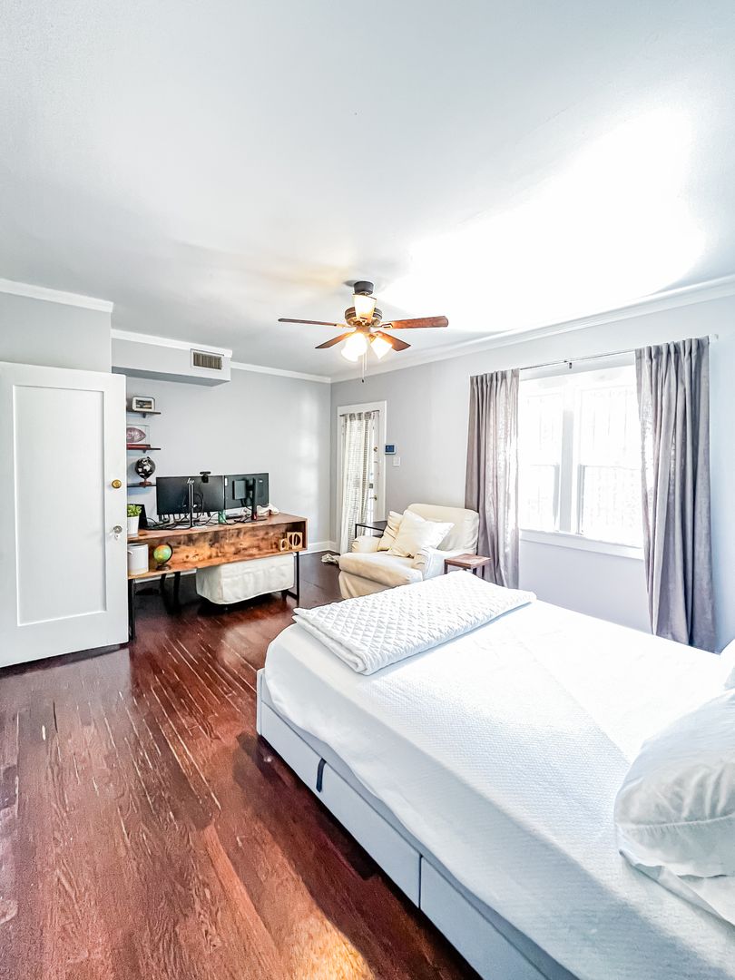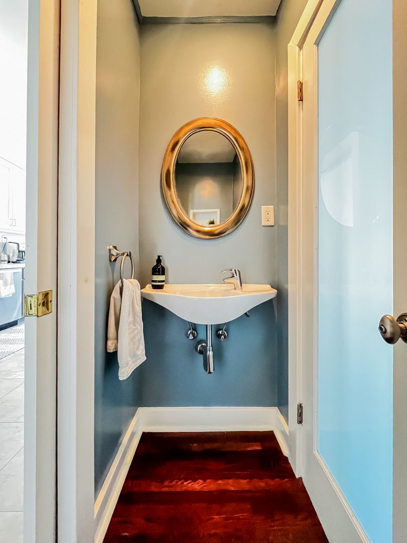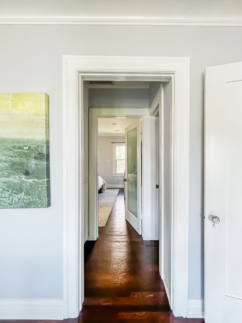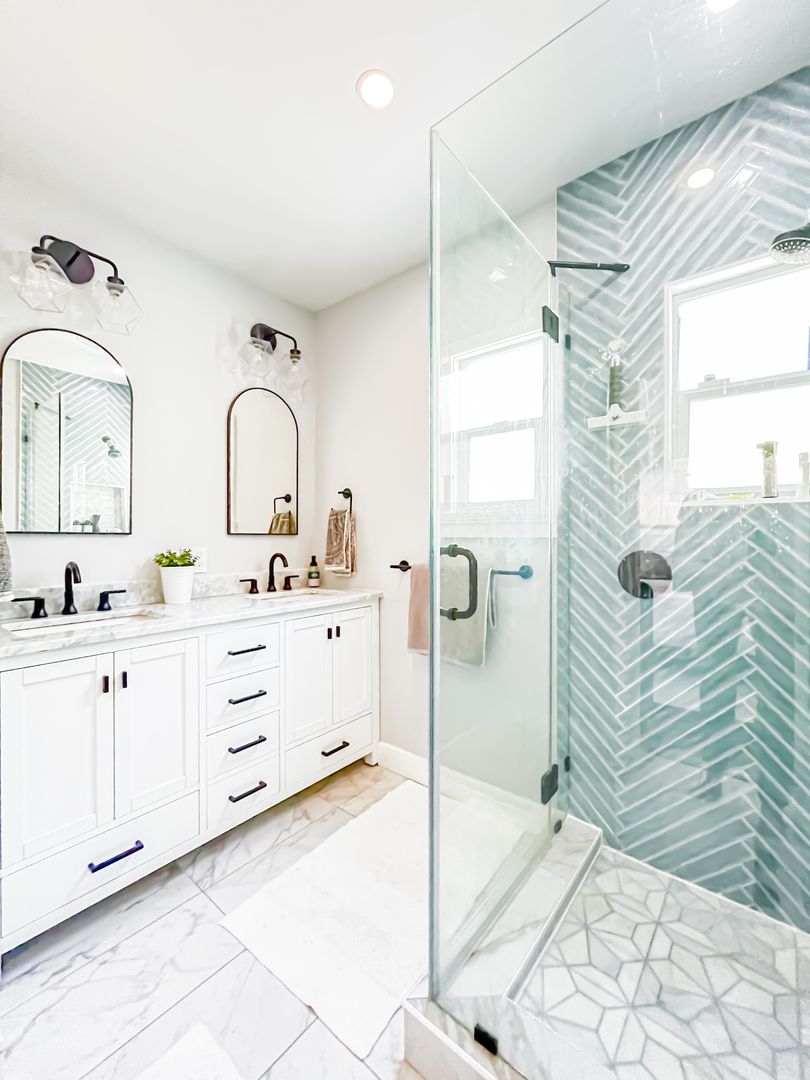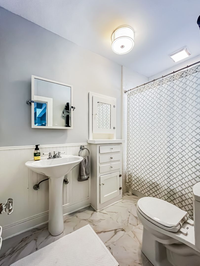 The hallway leading to the primary suite includes a convenient powder room for guests. The main bedroom offers a generous retreat, while the newly updated en-suite bathroom exudes luxury with dual sinks, matte black fixtures, and a handsome herringbone-tiled shower.