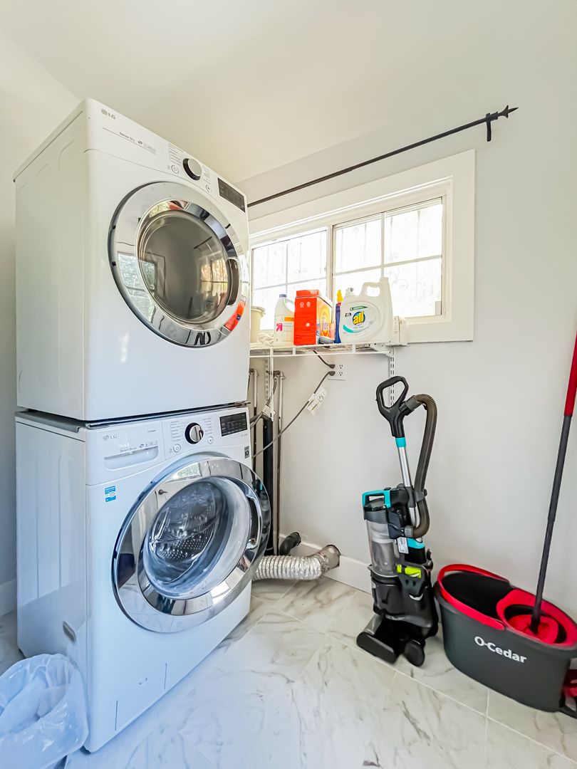 Stackable Washer/Dryer, Central A/C, and heat. Gardener included.